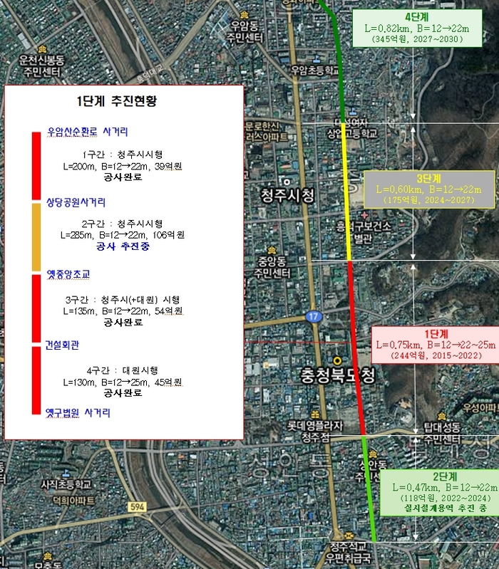 청주시 관계자는 “공사 기간 동안 차로 조정 및 교통 전환으로 통행에 어려움이 있으나 협조해주시는 시민들께 감사드린다”며, “공사가 조속히 추진될 수 있도록 건축물 철거공사와 도로 공사를 계획대로 추진하도록 최선을 다하겠다”며, “1단계가 마무리되는 대로 2단계 공사(구법원사거리~영운로 일원)도 조속히 추진될 수 있도록 설계 및 보상 업무에 만전을 기하겠다”고 말했다.