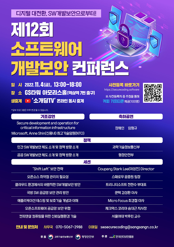 또한 기업의 SW 개발 보안 적용 모범사례 공모전과 예비 개발자인 대학생 대상의 SW 개발 보안 경진대회의 시상 및 발표도 예정돼 있다.