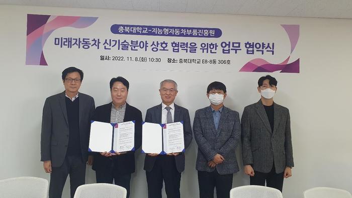 이날 협약식은 충북대 디지털혁신공유대학사업단의 김곤우 단장, 이민섭 초빙교수 등이 참석했고, 지능형자동차부품진흥원의 성명호 원장, 조봉균 전략기획본부 팀장, 허준호 선임연구원이 참석했다.