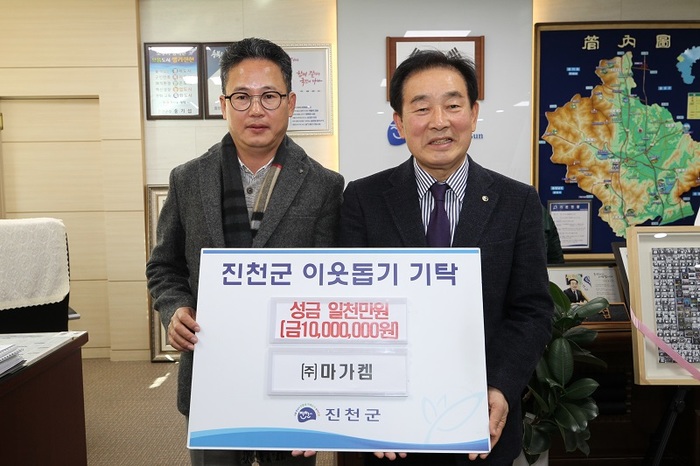 진천군은 ㈜마가켐이 진천군청을 찾아 이웃돕기 성금 1000만원을 기탁했다고 1일 밝혔다.