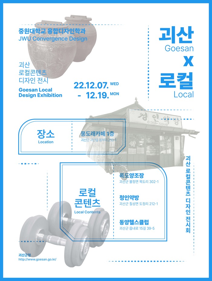 이번 전시는 괴산에서 역사, 문화적으로 잠재성 있는 장소를 발굴하고 이를 학생들의 창의적인 아이디어로 디자인해 새로운 괴산의 로컬콘텐츠로 제시한 지역특화 프로젝트이다.