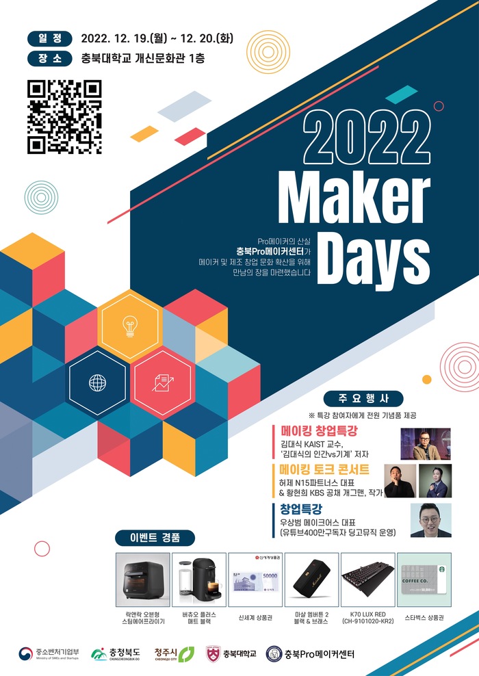 충북Pro메이커센터는 오는 19일~20일 양일간 충북대학교 개신문화관에서 메이커스페이스 재인식 및 메이커 문화 확산을 위한 '2022년 메이커 데이즈'를 개최한다.