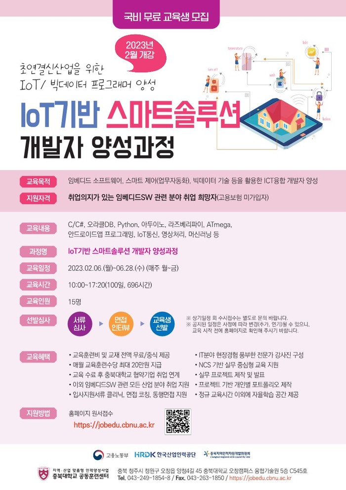 충북대학교 공동훈련센터가 오는 24일까지 2023 국비 과정 교육생을 모집한다. 이번에 모집하는 교육은 ▲산학협력 전문인력 양성과정 ▲IoT 기반 스마트 솔루션 개발자 양성과정 ▲푸드테크니션 양성과정 등 3과목이다.