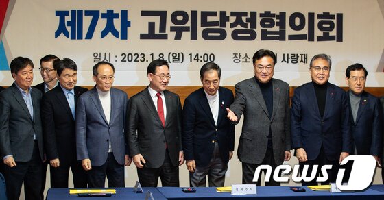 | 정진석 국민의힘 비상대책위원장(오른쪽 세번째)이 8일 서울 여의도 국회 사랑재에서 열린 제7차 고위당정협의회에서 기념 촬영 후 한덕수 국무총리에게 자리를 안내하고 있다. 왼쪽부터 김대기 대통령 비서실장, 방문규 국무조정실장, 이주호 사회부총리 겸 교육부 장관, 추경호 경제부총리 겸 기획재정부 장관, 주호영 국민의힘 원내대표, 한 총리, 정 비대위원장, 박진 외교부 장관, 이창양 산업통상자원부 장관. 2023.1.8/뉴스1 © News1 유승관 기자 |