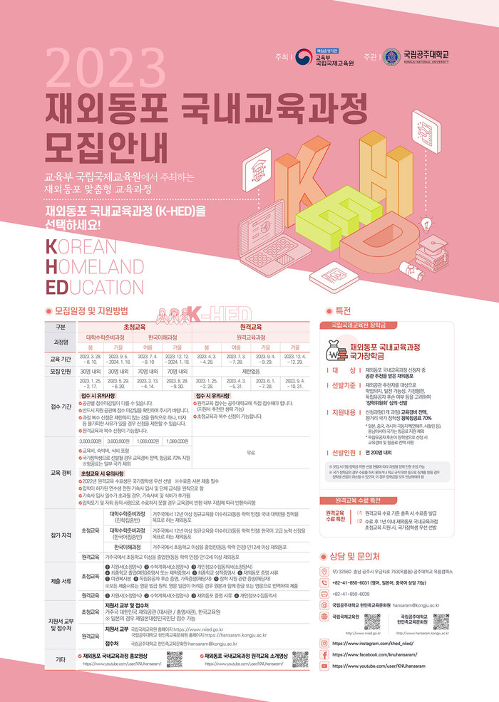 국립공주대학교는 오는 25일부터 국립국제교육원이 주최하는 ‘2023 재외동포 국내교육과정’ 초청교육과정 및 원격교육과정 참가자를 모집한다고 밝혔다.