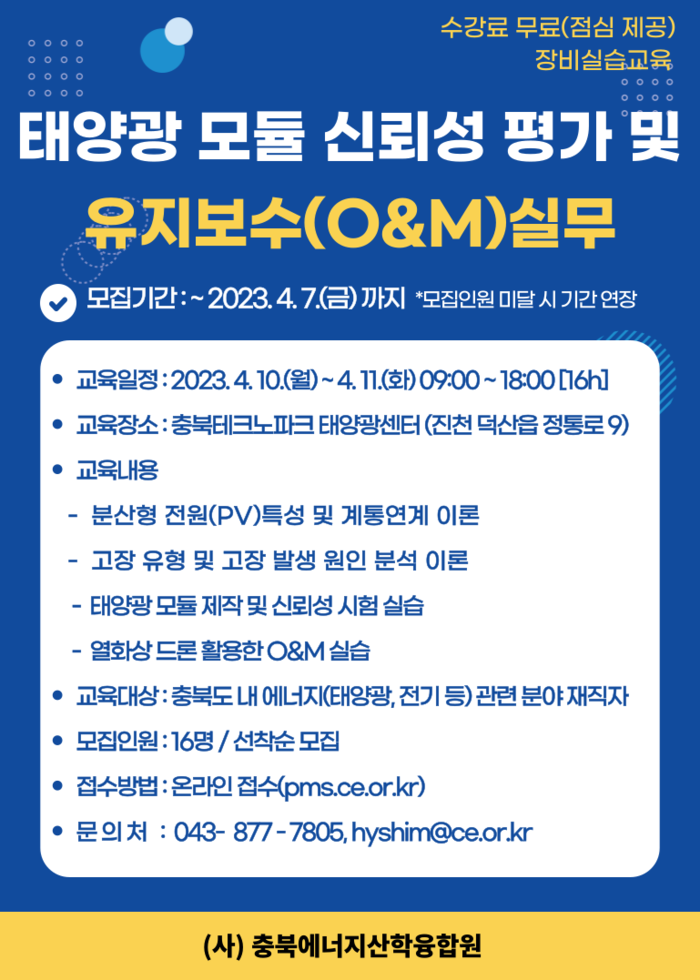 충북에너지산학융합원은 태양광 발전 시스템 관리 능력 향상을 위해 23일부터 4월 7일까지 ‘태양광 모듈의 신뢰성 평가 및 유지보수 실무’과정 교육생을 모집한다.