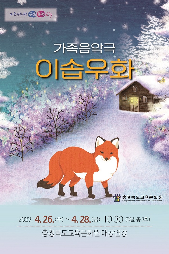충북교육청 직속기관 교육문화원은 오는 26일부터 28일까지 3일간, 총 3회에 걸쳐 교육문화원 대공연장에서 도내 유치원‧초등학생 2700명을 대상으로 음악극 '이솝우화'기획공연을 선보인다고 밝혔다.