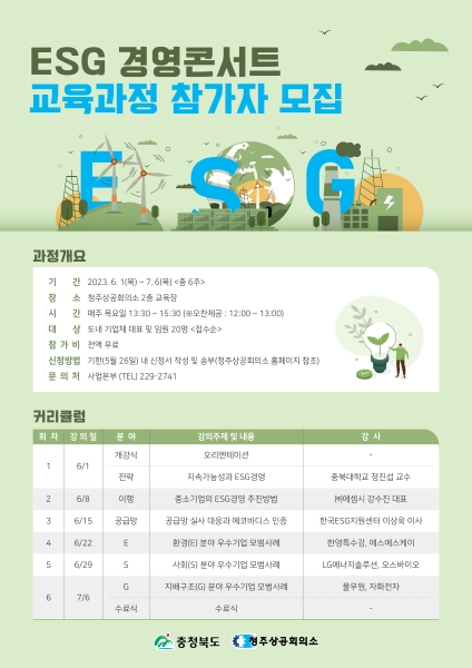 청주상공회의소가 도내 기업체 대표 및 임직원을 대상으로 'ESG경영콘서트' 교육과정을 운영한다.