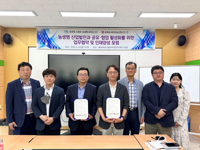 충북대 LINC 3.0 사업단 바이오농산업 ICC가 공주대 스마트 농생명 바이오 ICC와 농생명 산업발전과 공유협업 활성화를 위한 업무 협약을 체결하고 인재 양성 포럼을 개최했다고 25일 밝혔다.