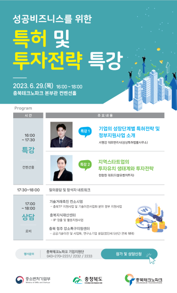 중소벤처기업부와 충북도가 주최하고 충북TP 주관으로 △기업의 성장단계별 특허전략 및 정부지원사업 소개 △지역스타트업의 투자유치 생태계와 투자전략 특강이 진행될 예정이다.