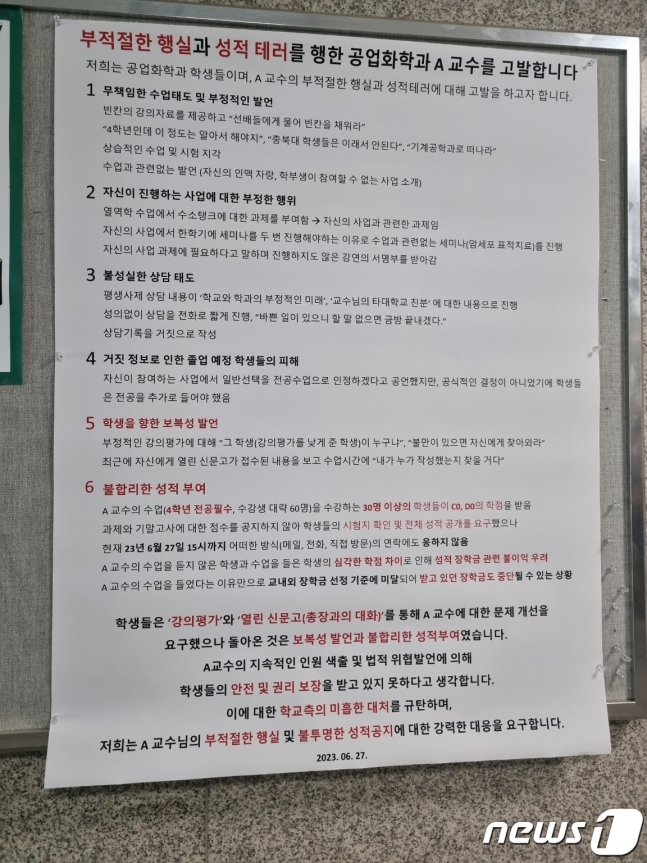 지난 27일 충북대학교 곳곳에는 공업화학과 학부생들이 붙인 대자보가 나붙었다. A 교수의 불성실한 수업태도와 성적 테러를 지탄하는 내용이었다.