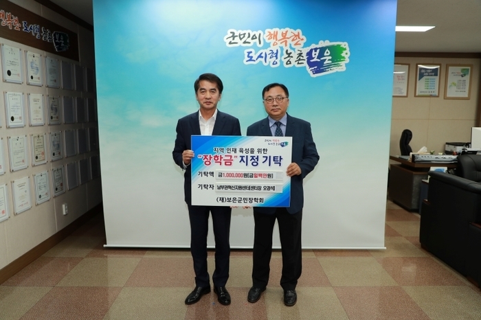 ![]() ▲ 7일 오경석 센터장(왼쪽)이 보은군민장학회에 장학금을 기탁하며 기념촬영을 하는 모습. |