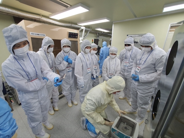 ![]() ▲ 한밭대학교 학생들이 반도체 클린룸에서 실습에 앞서 관계자의 설명을 듣고 있다. |
