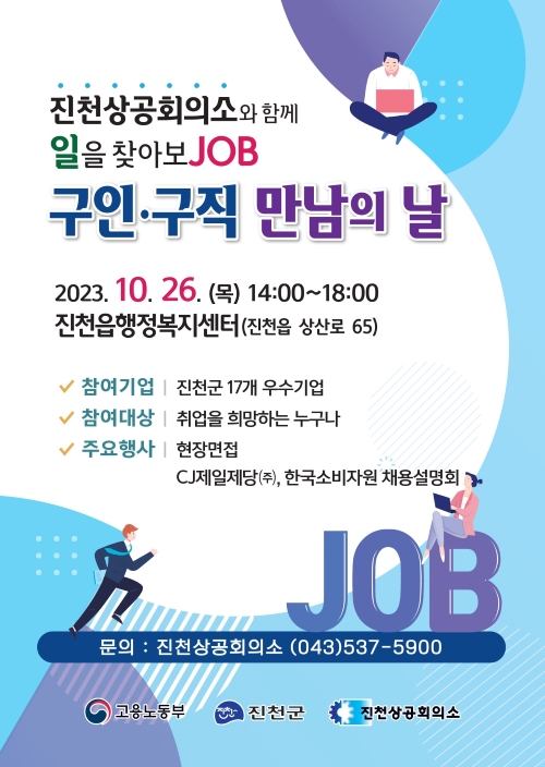 진천상공회의소(회장 왕용래)는 26일 오후 2시부터 6시까지 진천읍 행정복지센터 2층 대회의실에서 ‘2023 구인구직 만남의 날’을 개최한다고 밝혔다.