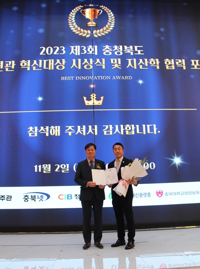 ![]() △한상배(왼쪽) 충북바이오헬스혁신센터장이 충북RIS사업 우수공모전 대상을 차지한 청주대 제약바이오메디컬전공 이정민 학생에게 상을 수여하고 있다. © 충북넷 |