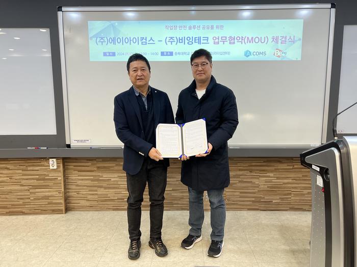 이날 협약식에는 최상현 에이아이컴스 대표이사와 주식회사 비잉테크의 유훈상 대표 및 관계자 등이 참석했다.