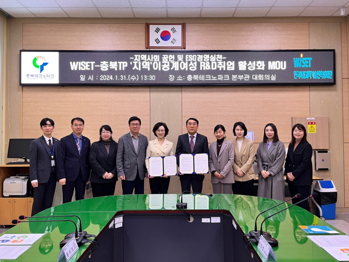 충북테크노파크와 한국여성과학기술인육성재단(WISET)은 31일 충북테크노파크에서 충청권 이공계 여성인재 취업 확대를 골자로 업무협약했다.