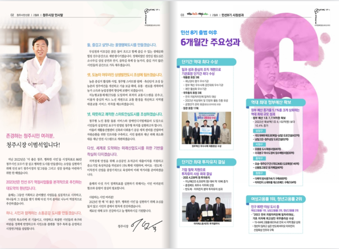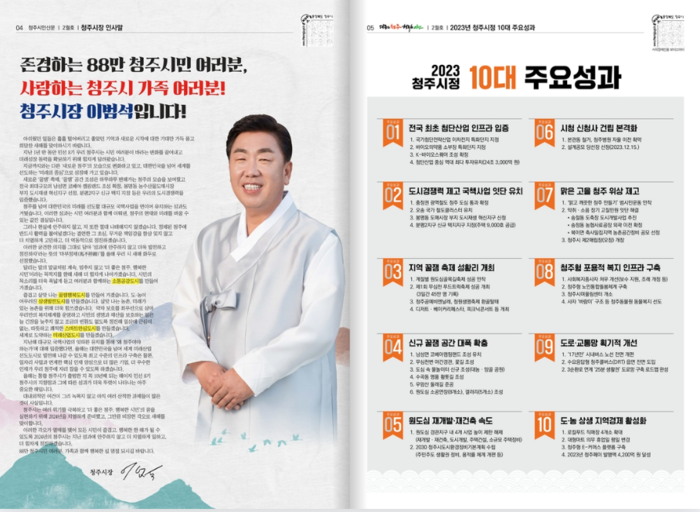 이범석 시장의 개인 신문이냔 비판을 의식한 듯 2024년 새해 인사와 2023 청주시정 10대 주요 성과를 실은 '청주 시민신문' 2월호가 지난해 2월호와 달리 이범석 시장의 활동사진을 대폭 축소해 발간하면서 그 배경이 궁금하다.