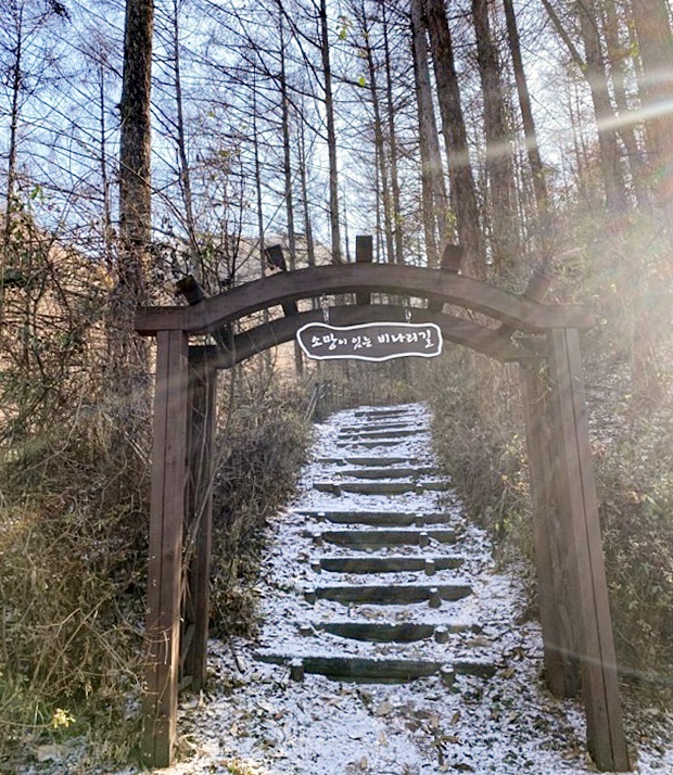 21일 군에 따르면 좌구정에서 삼기저수지(등잔길·0.9㎞) 길은 10여년 전 군이 길 옆에 3대 종교를 의미하는 쉼터를 조성하고 1008개 목 계단으로 길을 내면서 ′비나리길′이 됐다.
