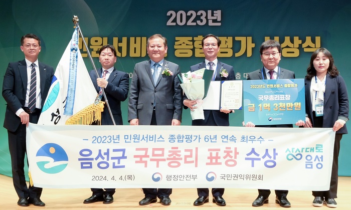 ![]() ▲ 음성군이 전국 지자체와 교육청 등 기관 306곳을 대상으로 2023년 민원서비스 종합평가에서 최고등급을 받아 4일 정부서울청사에서 국무총리 표창을 받았다.(음성군 제공) © 충북넷 |