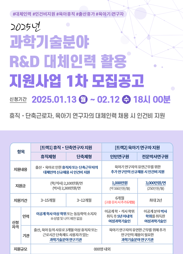 트랙2는 만 8세 이하 자녀를 둔 육아기 연구자의 대체인력 채용 시 인건비와 전문교육을 지원하는 사업이다.