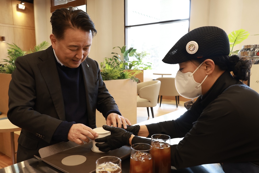 ![]() ▲ 김영환 지사가 10일 청남대 대통령기념관 Cafe The 청남대에서 음료를 받아가고 있다. /충북도 제공. |