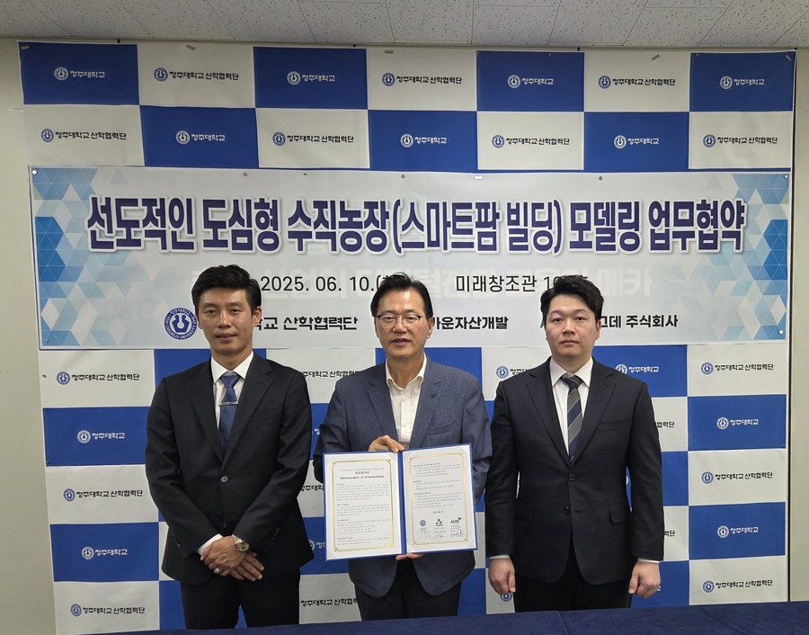 [충북넷 조민상 기자] 청주대 산학협력단은 ㈜가운자산개발, 아그데 주식회사와 ‘선도적인 도심형 수직농장(스마트팜 빌딩) 모델링' 을 골자로 업무협약했다.