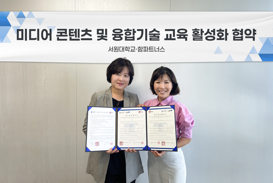 서원대 미디어콘텐츠학부와 ㈜함파트너스는 △대학-유관기관 네트워크 구축을 통한 교육 협력 생태계 조성 △미디어콘텐츠·융합기술 관련 현장 실무 교육 및 인턴십 연계 △우수 인재 발굴 및 취업 지원 △현장 중심 교육 프로그램·콘텐츠 공동 개발 △기타 상호 협의에 따른 교육·연구 등에 협력키로 했다.