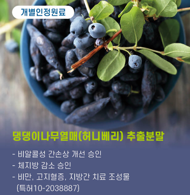 창립 첫해인 2019년 허니베리(댕댕이나무 열매) 추출물로 ‘비알콜성 간 손상 개선’ 개별인정원료(2019-19호)를 획득하며 업계의 주목을 받았고, 이 성과를 기반으로 2021년 국내 최초의 비알콜성 간 기능 개선 건강기능식품을 출시했다. 이 원료는 안토시아닌 성분을 핵심 기능물질로 하며, 간 건강·항산화 분야에서 활용도가 높다.