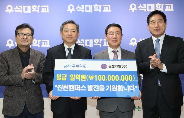 [충북넷 신수빈 기자] 충북 진천 향토기업 금성개발㈜은 지난해에 이어 올해도 학교법인 우석학원과 우석대 진천캠퍼스에 1억 원을 쾌척했다.