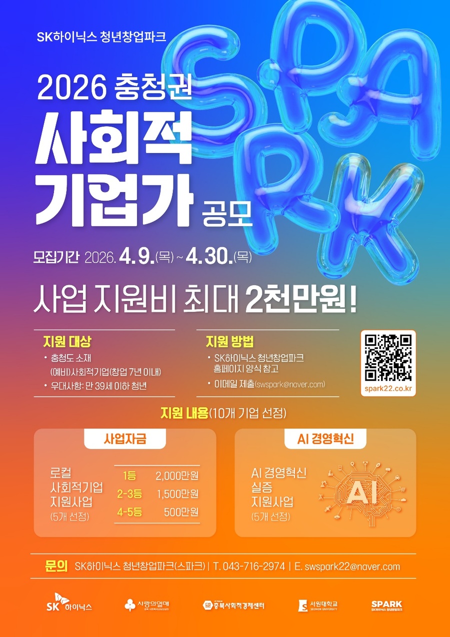 [충북넷 신수빈 기자] 서원대 SK하이닉스청년창업파크(이하 SPARK)는 충청권 사회적기업의 성장과 혁신을 지원하기 위해 ‘2026 충청권 사회적기업가 공모’를 추진한다.