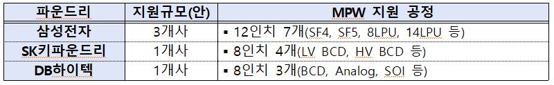 ![]() ▲국내 파운드리 3사별 MPW 지원 규모와 공정. |