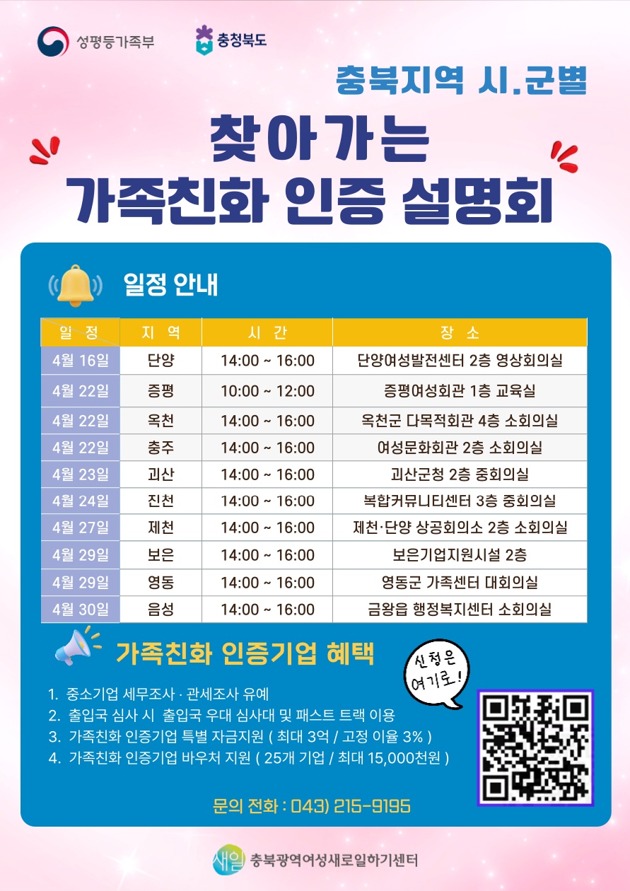 특히 가족친화인증에 관심 있는 기업은 충북여성새로일하기지원본부로 문의하면 신청서 작성 등 1:1 컨설팅을 제공받을 수 있다.