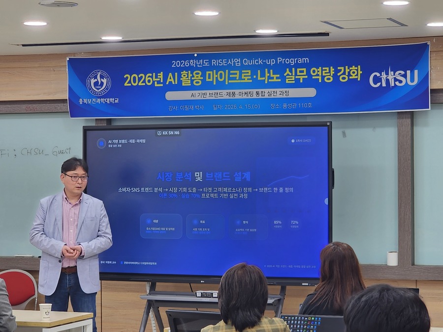 충북보건과학대 AI-CARE센터는 15일 ‘AI 기반 브랜드·제품·마케팅 통합 실전 과정’을 주제로 RISE 사업 ‘퀵업(Quick-up) 프로그램’을 운영했다.