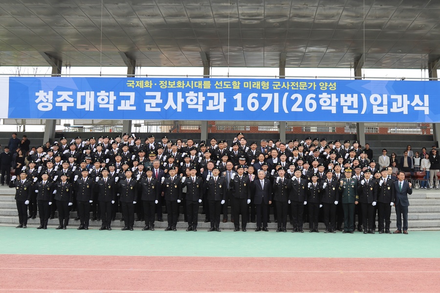 [충북넷 신수빈 기자] 청주대는 17일 종합운동장에서 ‘16회 군사학과 입과식 및 승급식’을 개최하고 신입생과 재학생들의 성장을 격려했다.