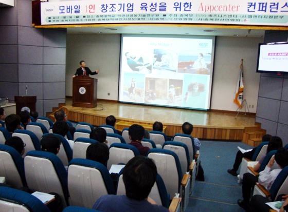 김진형 교수는 31일 오후 충북대 학연산공동기술연구원에서 충북넷과 (사)앱센터지원본부가 공동으로 연 ‘모바일 1인 창조기업 육성을 위한 앱 센터 컨퍼런스’에서 ‘모바일 앱, 기회와 도전’이라는 주제로 발표했다.