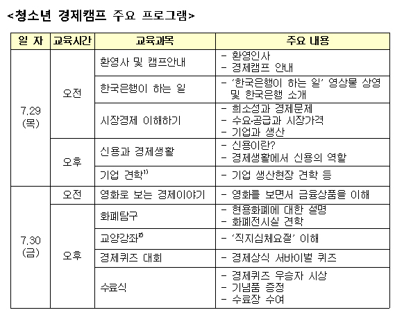 청소년 경제캠프는 청소년들의 경제‧금융 현상에 대한 이해력 제고, 바람직한 경제관 함양 등을 위해 여름방학마다 개최했다.