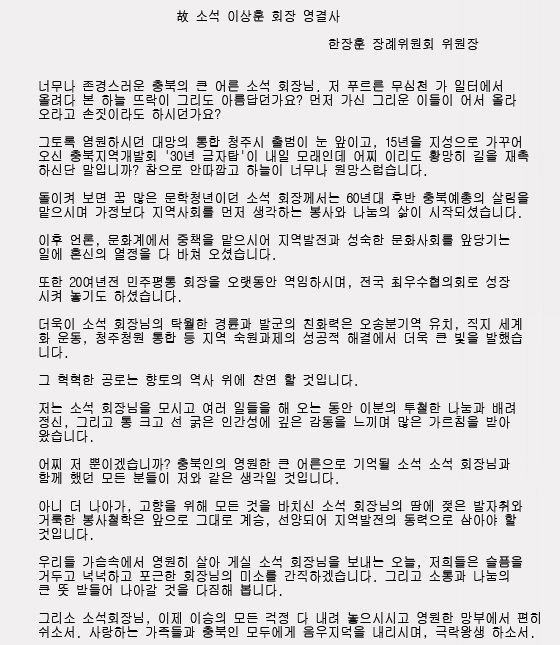 이어 장의위원회 한장훈 · 이시종 · 이두영 · 신영희 공동위원장의 조사에 이어 홍강리 시인의 '소석선생 영전에 바치는 시' 추도시(홍민하 딩아돌하 대외협력국장) 낭독이 이어졌다.