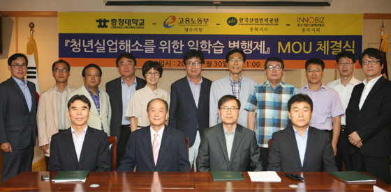 충청대학교와 고용노동부청주지청, 한국산업인력공단충북지사, (사)중소기업기술혁신협회충북지회(이노비즈협회)는 30일 일·학습 병행제를 통합 일자리 창출 업무협약을 체결했다.