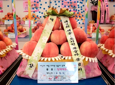 | ▲ 지난 2일 세종전통시장에서 열린 제2회 조치원복숭아축제 품평회에서 대상을 받은 복숭아. |