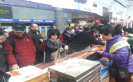 곶감 특판행사장에서는 깊은 산골의 차갑고 신선한 바람이 만들어 과육이 차지고 쫄깃한 영동 곶감을 시중보다 저렴한 햇곶감을 구입하려는 시민과 철도 이용객들로 북새통을 이뤘다.