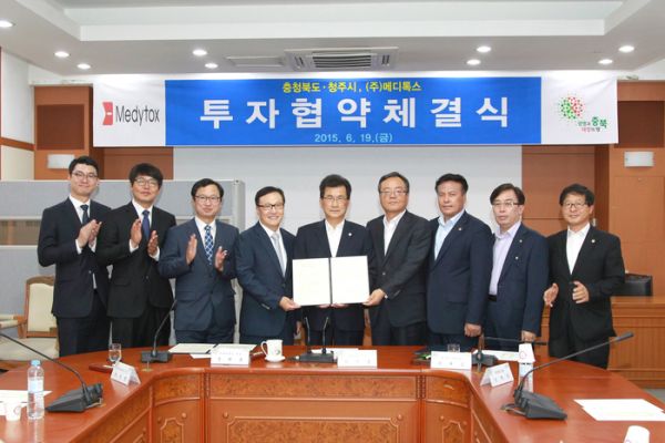 글로벌 바이오제약기업인 ㈜메디톡스가 오송생명과학단지에 생산 공장과 최첨단 공정시스템을 구축한다. 메디톡스는 지난 19일 충북도청 소회의실에서 도‧청주시와 오송생명과학단지 내 공장 신설 투자에 관한 협약을 체결했다고 22일 밝혔다. 메디톡스는 올해부터 2019년까지 5년간에 걸쳐 총 556억원을 투자한다는 계획이다. 오송생명과학단지 일원에 부지 14,725㎡, 건축면적 15,328㎡에 보툴리눔 톡신과 필러 생산을 위한 생산시설과 최첨단 공정 시스템을 구축한다. 메디톡스는 의약품 관련 기술 및 제품 제조업체로 2000년 5월 설립, 보톡스로 잘 알려진 보툴리눔 톡신 제품 개발에 국내 최초이자 세계 네 번째로 성공한 기술력 있는 기업으로 전 세계 60여개국에 수출하고 있다. 오창과학산업단지에 본사를 겸한 공장을 두고 있는 메디톡스는 지난 2013년 선진국 우수의약품 품질관리 제조기준(cGMP 및 EU GMP)에 부합하는 오송 제1공장을 완공한 바 있으며, 이번 추가 투자로 전 세계 시장 점유율을 확대하고 글로벌 바이오 제약기업으로 자리매김해 나갈 계획이다. 특히, 지난 2013년에는 글로벌 제약기업인 미국 엘러간사와 약 3,900억원 규모의 기술 수출 계약을 체결한 바 있으며, 세계 최초로 액상형 보툴리눔 톡신 제품을 개발해 지난해 국내 시장에 처음으로 선보이는 등 글로벌 바이오 제약기업으로 발돋움하고 있다. 이번 투자를 통해 100명 이상의 신규직원을 채용할 예정이다. 이날 체결식에서 이시종 충청북도지사는 “충북은 2020년까지 투자유치 30조원, 일자리 40만개, 고용률 72%, 수출 연 200억불을 달성하여 충북경제를 전국대비 4%대로 끌어올린다는 계획이다. 바이오산업은 이를 실현하기 위한 충북의 대표적 전략산업 중 한 분야”라고 설명하면서 “이를 위해 외지 기업의 충북 유입도 중요하지만 무엇보다 지역기업의 역할이 중요하다. 충북에 본사를 두고 있는 기업으로서 기업의 역량을 결집해 나가주길 바란다”고 당부했다. /오홍지기자