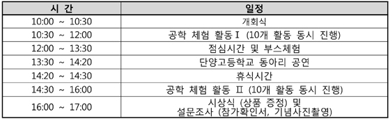 진행은 ▶창의적 스치로폼 비행기 ▶기계 요소 맛보기 ▶소프트웨어와 나의 미래 ▶DNA전기영동과 정제 ▶손 소독제 만들기 ▶레몬 스킨 만들기 ▶도시 모형 만들기 ▶오염된 물 정수 ▶스피커 만들기 ▶바이러스 한번에 정복 등의 공학 체험 활동이 있다.