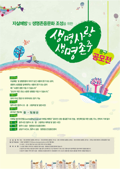 신청은 초·중·고등학생, 일반시민 등 청주시민 누구나 참여가능하며 오는 6일부터 31일까지 청주시 상당·청원정신건강증진센터 이메일 (cwmhc@hanmail.net)로 제출하면 된다.