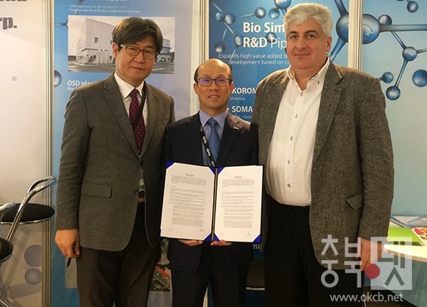 | ▲ 지난달 24~26일 독일 프랑크푸르트 Messe Frankfurt에서 열린 ‘CPhI Worldwide 2017(세계의약품전시회)’에서 한국코러스가 바이어와 수출계약을 체결한 후 기념사진을 찍고 있다. (충북TP 제공) |