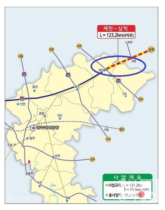 ![]() ▲ 동서 6축(제천~삼척)고속도로 건설 제천~영원 구간 안내도. (국토부 제공) © 충북넷 |