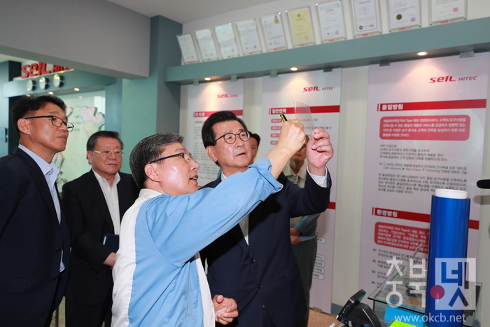 소재부품 국산화에 성공한 기업과 제품을 소개하는 생산라인 투어 형식으로 진행된 이 지사의 이날 방문에는 경제통상국장 등 충북도 관계자와 이상린 충북수출클럽 회장, 이명재 오창과학산업단지관리공단 이사장 등 총 10여명이 동행했다.
