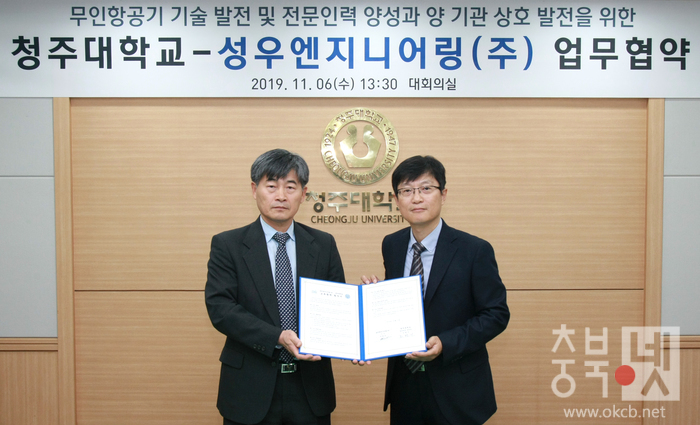 청주대학교는 6일 오후 대학 본관 대회의실에서 ‘무인항공기 전문인력 양성 및 드론 기술 개발’을 위해 성우엔지니어링(주)와 업무협약을 체결했다.
