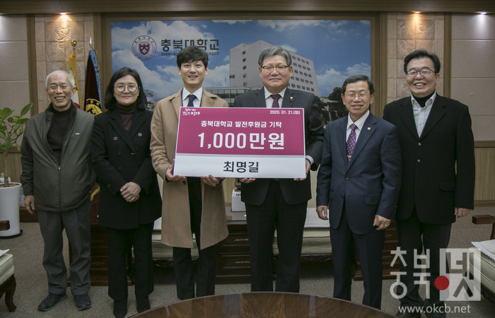 [충북넷=이정은 기자] 충북대학교 최명길 동문(미생물학과 02학번, 인사이드 대표)은 21일 오후 2시 대학본부 5층 접견실에서 미생물학과 장학기금 1000만 원을 기탁했다.