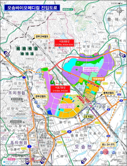 ‘오송 바이오메디컬지구 진입도로’는 총연장 2.39km 4~6차선 도로를 건설하는 것으로 2022년까지 468억원을 투입해 오송1산단과 오송2산단을 연결하는 것으로, 작년 11월 보상계획 공고 후 현재 협의보상중이며, 공사는 오는 3월에 착공할 예정이다.